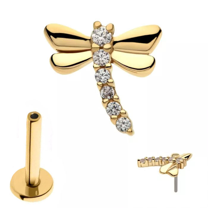 Enhance your piercing collection with the exquisite 14kt Gold Dragonfly Labret. This stunning piece is not just a labret; it's a statement of elegance and individuality. The intricate dragonfly design, embellished with sparkling clear crystals, is crafted to capture the light beautifully and draw admiration wherever you go.
