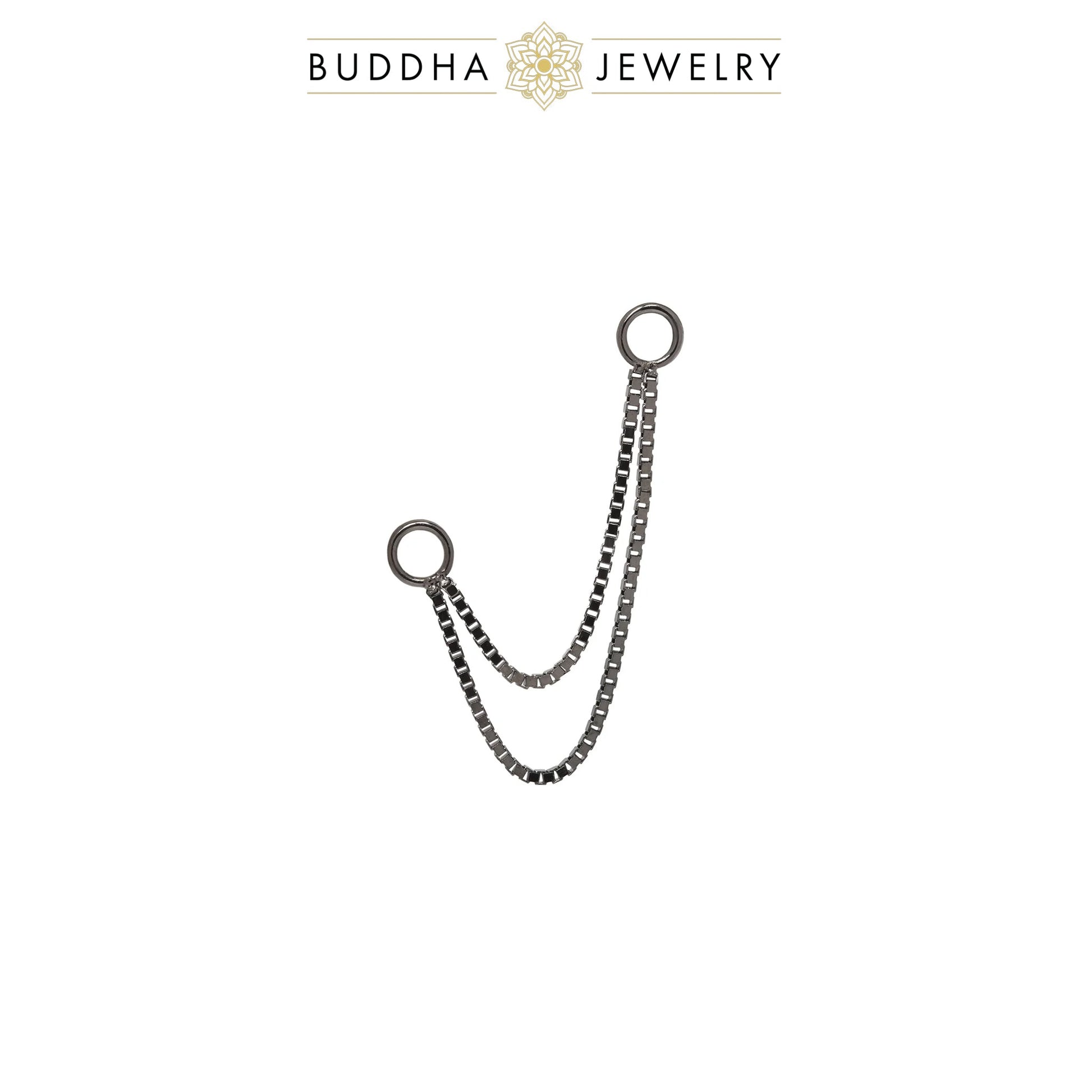 Unleash your inner rebel with our Black Rhodium Double Box Chain. This bold accessory, coated in black rhodium over yellow gold, adds a fierce edge to your look. Attach the jump rings to the front and back of your piercing post for a punk rock vibe that amps up any of our gold ends.