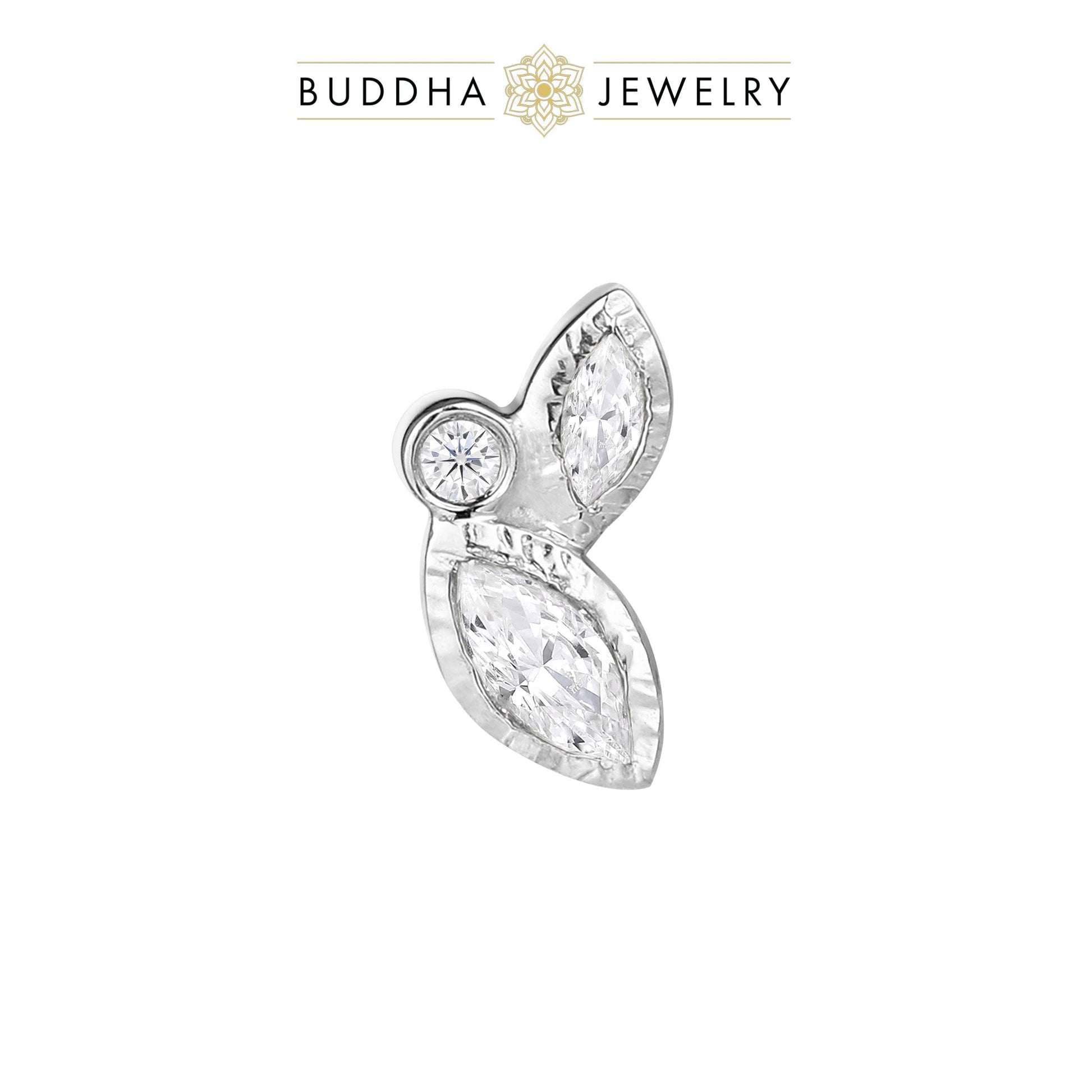 Gold opposing leaves shelter a minimalistic circle, all adorned with CZs in the center of each shape. Impulse captures light and glistens with ease in a wonderful assortment of piercings.