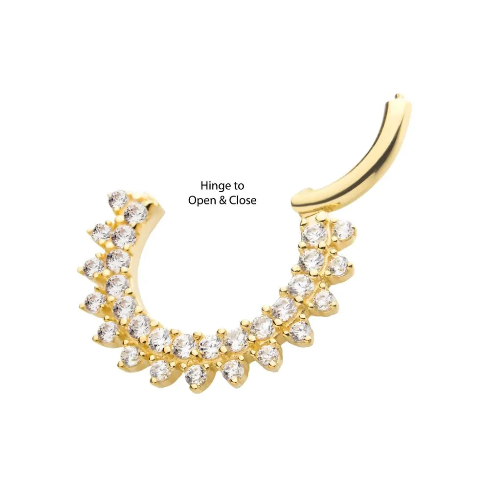 14Kt Gold Two Row Prong Set Gem Cluster Front Facing Hinged Segment Clicker. The Hinged Segment Clicker offers an easy-to-use design with a minimal seam for an aesthetic that's similar to a segment ring without the stress of dealing with a segment that can get lost. The Hinged Segment Clicker is characterized by the hinged prong that snaps into place with a satisfying click. Perfect for Helix, Septum and Cartilage. Made of solid 14kt nickel-free Gold.