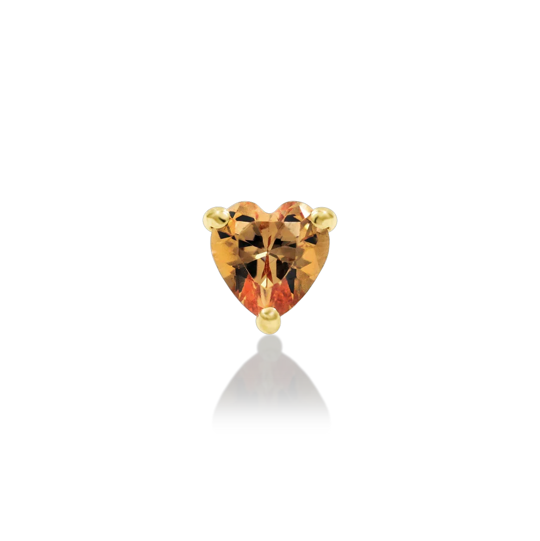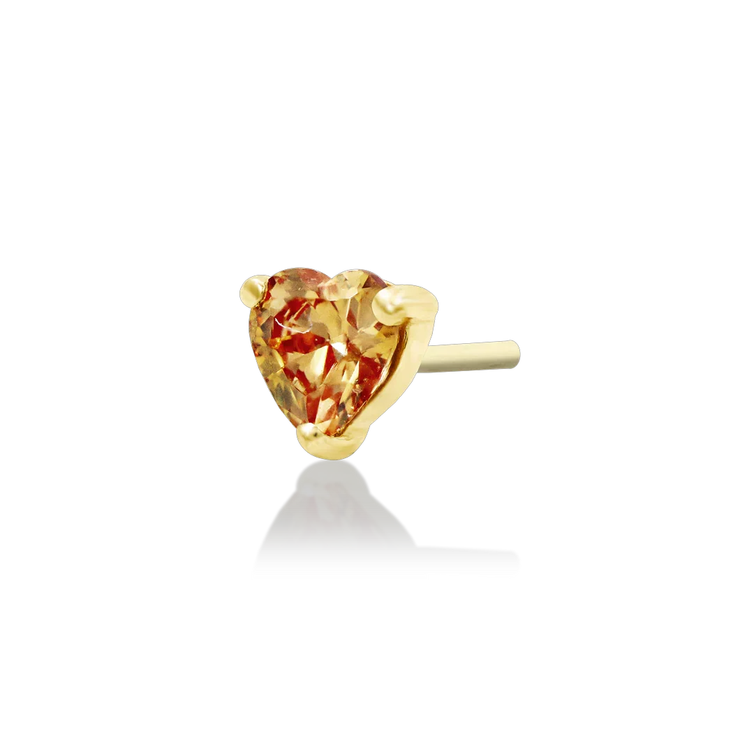 A twist on a classic, a 3mm brilliant cut dark champagne heart gem on a solid gold prong setting, available in 14k Yellow, Rose and White gold. It measures 3.4mm x 3.3mm.
