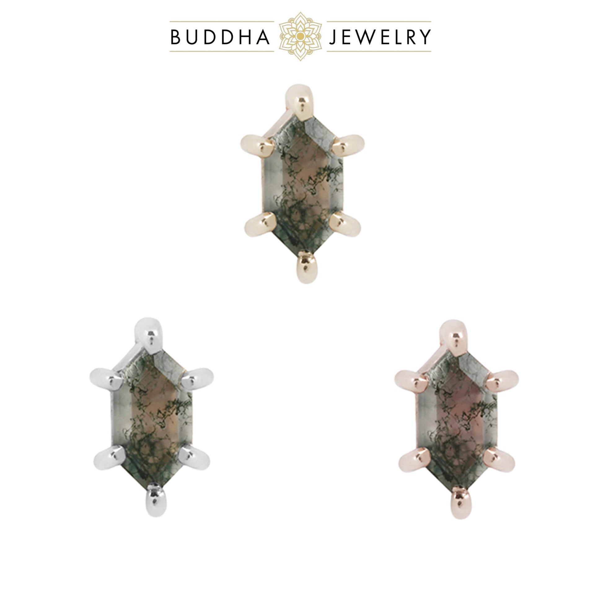 Oh Hell Yes, we are so excited about this new end! Six prongs on each point of this hexagon cut gemstone make sure it's nice and noticeable! The prongs are spaced perfectly allowing the light to hit the Moss Agate showing off all of those stunning inclusions!